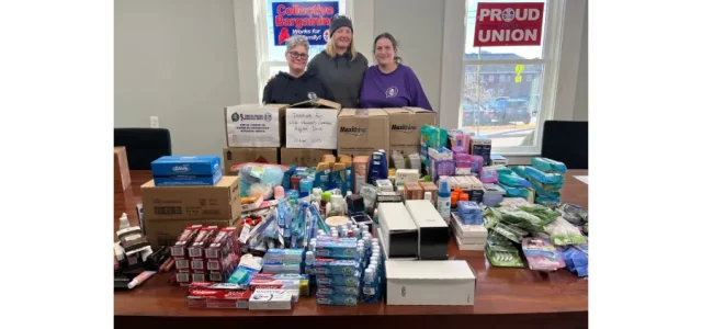 The Machinists Local S6 Women’s Committee at Bath Iron Works contributed an impressive amount of hygiene products as part of its annual Hygiene Drive for Domestic Violence Awareness Month. The donations were given to New Hope Midcoast which provides support, advocacy, prevention, and education services for people affected by domestic abuse, dating violence, and stalking. New Hope Midcoast serves Sagadahoc, Lincoln, Knox, and Waldo counties.